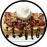 Mevsim meyveleri, özel çikolata sosu ve fındık parçaları eşsiz lezzetteki waffle hamuru ile buluşuyor. Kaymaklı dondurma ile taçlanan şahane bir tatlı.