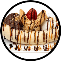 Muzlu, çikolatalı, karamelli dondurma; muz dilimleri, yulaflı bisküvi parçaları, toz fındık-fıstık, karamel sos ve dekor çikolata ile servis edilir.